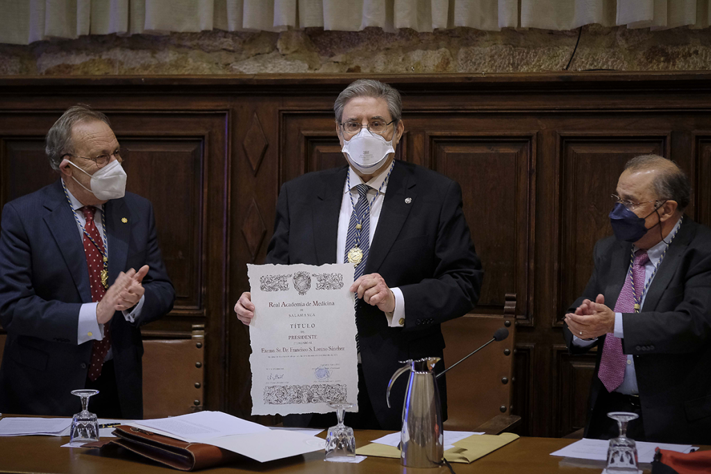La Real Academia de Medicina de Salamanca celebró el jueves 27 de enero, a las 19 horas, el acto de apertura del curso 2022 en el Aula Unamuno de las Escuelas Mayores de la Universidad de Salamanca. Durante el mismo tuvo lugar la toma de posesión de la nueva Junta de Gobierno, presidida por el doctor Francisco Lozano Sánchez, al que acompañarán en la nueva dirección los doctores Cándido Martín Luengo (Vicepresidente), Juan Fernando Masa Jiménez (Secretario General), Luis García Ortiz (Tesorero) y Consuelo del Cañizo Fernández-Roldán (Bibliotecaria).
